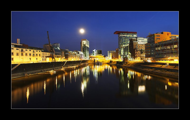 We werpen een snelle blik op het sfeervolle interieur van restaurant Gehry’s, vernoemd naar de Amerikaanse architect Frank Gehry, in het door hem ontworpen witte Zollhofgebouw. Er zit geen mens. Zou de opmerking van projectontwikkelaar Jürgen Overdiek nog steeds actueel zijn? “In de Medienhafen is te weinig leven. Het is de bedoeling dat er een urbane cultuur gaat ontstaan, maar dat ontbreekt er nog aan”, zegt hij in de zomer van 2006 in een interview met het regionale dagblad Rheinische Post.
