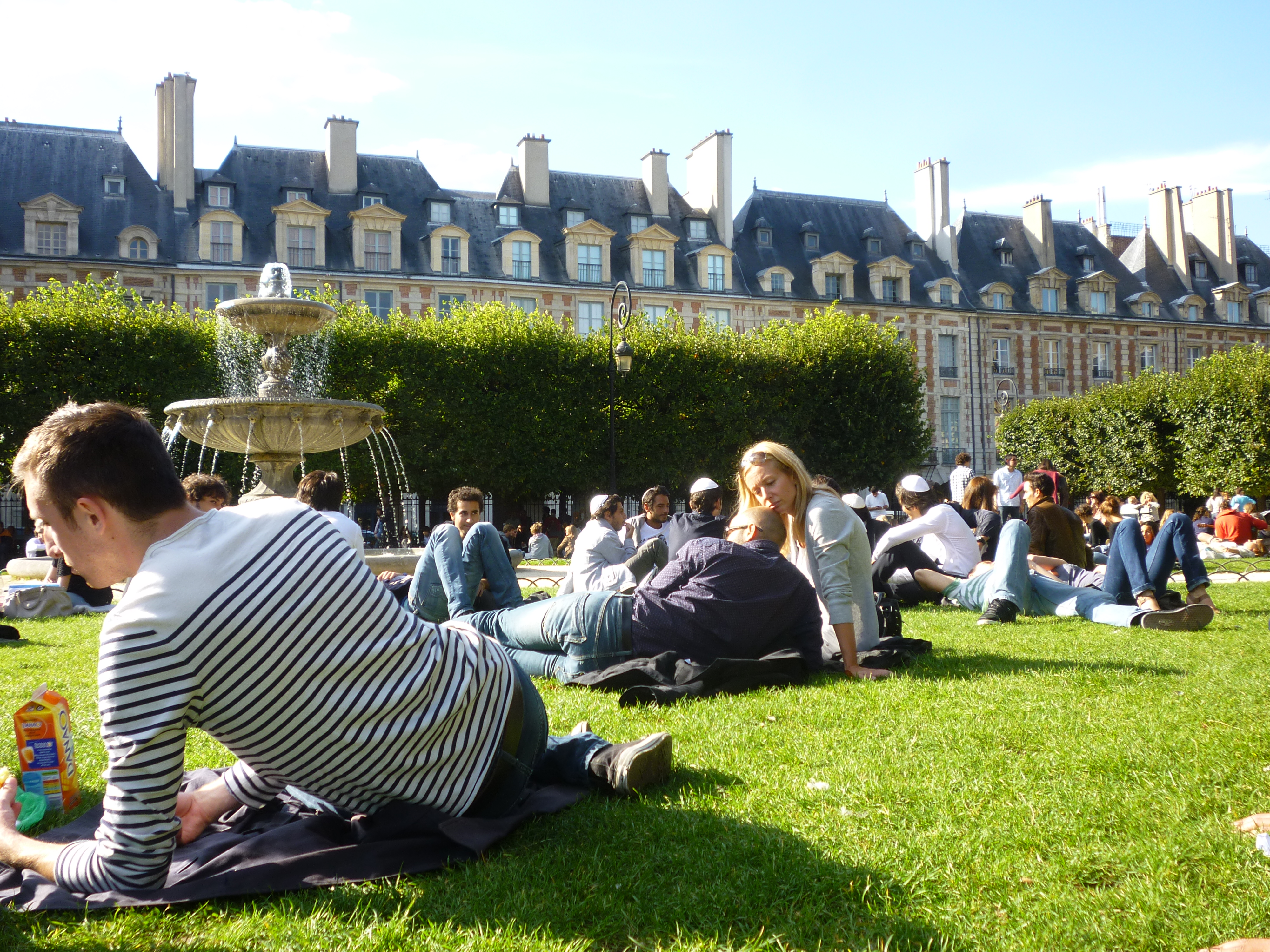 Het is niet mijn eerste rendez-vous met Place des Vosges. Maar zelden heeft het er zo uitnodigend en uitdagend bijgelegen. De najaarszon bespeelt de mensen als marionetten. Ze liggen, zitten, gaan staan, gebaren, gaan weer zitten of staan, lopen weg, komen terug. Of niet. Overal op het gras zie je mensen. Alleen, met z’n tweeën of in groepjes. Gezinnen, vrienden, koppels, verzin het maar.