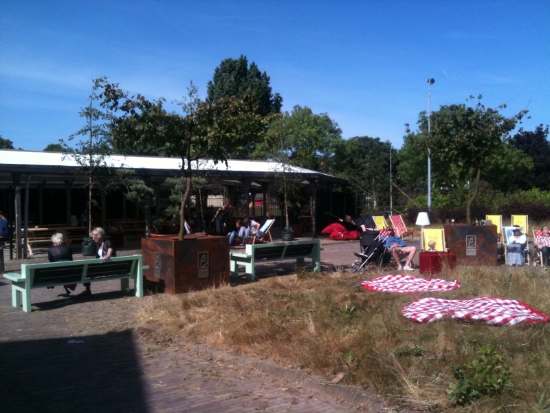 Best jammer. Het terras, in de schaduw van een immense fabriekshal op het terrein van AkzoNobel, is één grote picknickplaats. In het gras zijn ronde dekens met een roodwit geblokt patroon neergelegd, bezoekers luieren en lezen in ligstoelen en zitzakken, daar tussen in grote bakken met planten. Onder een, wat nog het meest lijkt op een met tentzeil overspannen fietsenstalling staan houten tafels die je kunt bestellen bij mijnpicknicktafel.nl.